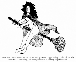A 12th century depiction of a cloaked but otherwise nude woman riding a large cat appears on a wall in the Schleswig Cathedral in Schleswig-Holstein, Northern Germany. Beside her is similarly a cloaked yet otherwise nude woman riding a distaff. Due to iconographic similarities to the literary record, these figures have been theorized as depictions of Freyja and Frigg respectively.[37]