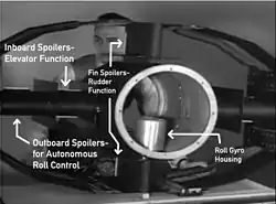 The Fritz X possessed a spoiler-based control setup on its tail fin unit, using three sets of aerodynamic control spoiler systems, with two of them giving control in the pitch and yaw axes, differentially operating and constantly oscillating rapidly under direct control from the Kehl-Straßburg radio control link. The roll control setup, operating autonomously and not under control from the deploying aircraft, oscillated similarly to those under the externally controlled sets, and were on the outboard sections of the horizontal tailfin surfaces within the annular set of outer tailfin surfaces. These were like the American Azon ordnance's aileron control surfaces in their purpose, commanded by an internal gyroscope in the tail's central housing in both the Azon and Fritz X, to keep the ordnance level during its trajectory. The inboard set of spoiler surfaces in the tailfin's horizontal surfaces, which used a set of wing fence-like flat surfaces for airflow separation from the autonomous roll control spoilers, controlled the pitch angle after release and were controlled by the radio control link, giving the Fritz X's bombardier in the deploying aircraft the ability to control the range of the drop, a capability that the Azon did not have. The yaw control spoilers housed in the vertical tail fin surfaces were also under control through the radio link, and had similar "fence" surfaces to guide airflow over them. All three spoiler surface sets barely protruded from the surface during operation, with the pair of spoiler systems under external control having a degree of "proportionality" in their operation by varying the "dwell time" spent on one side or the other during their rapid rate of oscillation from side to side when a control input was sent to them.[7]