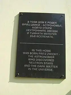 Fritz Zwicky was born in Varna, Bulgaria, to a Swiss father (citizenship in Mollis, Glarus[5]) and Czech mother. His father, Fridolin (b. 1868), was a prominent industrialist in the Bulgarian city and also served as Norwegian consul in Varna (1908–1933).[6] Fridolin Zwicky designed and built his family's Zwicky House in Varna. Fritz's mother, Franziska Vrček (b. 1871), was an ethnic Czech of the Austro-Hungarian Empire. Fritz was the oldest of three children: he had a brother named Rudolf and a sister, Leonie. Fritz's mother died in Varna in 1927. His father lived and worked in Bulgaria until 1945, and returned to Switzerland after World War II. Fritz's sister Leonie married a Bulgarian from Varna and spent her entire life in the city.[7]
