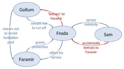 Frodo is at the centre of a complex web of medieval feudal-style allegiances and betrayals, involving Sam, Gollum, and Faramir. Sam serves him faithfully, but accidentally betrays him to Faramir with the smoke from his cooking fire, and then by mentioning the Ring. Frodo offers his service to Faramir, who reciprocally grants him protection in the manner of a feudal lord to a vassal. Gollum swears to Frodo not to run off, and for a time guides him faithfully; Frodo is obliged by Faramir to lure Gollum into captivity, which Gollum sees as a betrayal. Gollum then swears to Faramir never to revisit the forbidden pool outside Faramir's secret stronghold. Frodo thus appears both as a feudal master (to Sam and Gollum) and as a feudal vassal (to Faramir).[21][22]