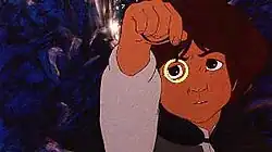 Frodo appears in adaptations of The Lord of the Rings for radio, cinema, and stage. In Ralph Bakshi's 1978 animated version, Frodo was voiced by Christopher Guard.[24] In the 1980 Rankin/Bass animated version of The Return of the King, made for television, the character was voiced by Orson Bean, who had previously played Bilbo in the same company's adaptation of The Hobbit.[25] In the "massive"[26] 1981 BBC radio serial of The Lord of the Rings, Frodo is played by Ian Holm, who later played Bilbo in Peter Jackson's film adaptation of The Lord of the Rings.[27] In Leningrad Television's two-part 1991 teleplay Khraniteli (Keepers [of the Ring]), Frodo was played by Valery Dyachenko,[28] while in the Finnish broadcaster Yle's 1993 television miniseries Hobitit, the role is played by Taneli Mäkelä.[29]