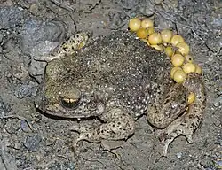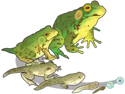 Some species of anurans hybridise readily. For instance, the edible frog (Pelophylax esculentus) is a hybrid between the pool frog (P. lessonae) and the marsh frog (P. ridibundus).[22] The fire-bellied toads Bombina bombina and B. variegata are similar in forming hybrids. These are less fertile than their parents, giving rise to a hybrid zone where the hybrids are prevalent.[23]