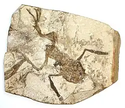 On the basis of fossil evidence, the earliest known "true frogs" that fall into the anuran lineage proper all lived in the early Jurassic period.[2][33] One such early frog species, Prosalirus bitis, was discovered in 1995 in the Kayenta Formation of Arizona and dates back to the Early Jurassic epoch (199.6 to 175 million years ago), making Prosalirus somewhat more recent than Triadobatrachus.[34] Like the latter, Prosalirus did not have greatly enlarged legs, but had the typical three-pronged pelvic structure of modern frogs. Unlike Triadobatrachus, Prosalirus had already lost nearly all of its tail[35] and was well adapted for jumping.[36] Another Early Jurassic frog is Vieraella herbsti, which is known only from dorsal and ventral impressions of a single animal and was estimated to be 33 mm (1+1⁄4 in) from snout to vent. Notobatrachus degiustoi from the middle Jurassic is slightly younger, about 155–170 million years old. The main evolutionary changes in this species involved the shortening of the body and the loss of the tail. Tadpoles of N. degiustoi constitute the oldest tadpoles found as of 2024, dating back to 168–161 million years ago. These tadpoles also showed adaptations for filter-feeding, implying residence in temporary pools by filter-feeding larvae was already commonplace.[37] The evolution of modern Anura likely was complete by the Jurassic period. Since then, evolutionary changes in chromosome numbers have taken place about 20 times faster in mammals than in frogs, which means speciation is occurring more rapidly in mammals.[38]