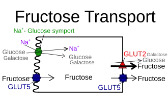 The mechanism of fructose absorption in the small intestine is not completely understood. Some evidence suggests active transport, because fructose uptake has been shown to occur against a concentration gradient.[39] However, the majority of research supports the claim that fructose absorption occurs on the mucosal membrane via facilitated transport involving GLUT5 transport proteins.[40] Since the concentration of fructose is higher in the lumen, fructose is able to flow down a concentration gradient into the enterocytes, assisted by transport proteins. Fructose may be transported out of the enterocyte across the basolateral membrane by either GLUT2 or GLUT5, although the GLUT2 transporter has a greater capacity for transporting fructose, and, therefore, the majority of fructose is transported out of the enterocyte through GLUT2.[40]