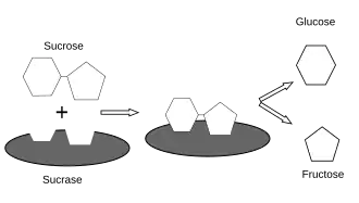 Fructose exists in foods either as a monosaccharide (free fructose) or as a unit of a disaccharide (sucrose). Free fructose is a ketonic simple sugar and one of the three dietary monosaccharides absorbed directly by the intestine. When fructose is consumed in the form of sucrose, it is digested (broken down) and then absorbed as free fructose. As sucrose comes into contact with the membrane of the small intestine, the enzyme sucrase catalyzes the cleavage of sucrose to yield one glucose unit and one fructose unit, which are then each absorbed. After absorption, it enters the hepatic portal vein and is directed toward the liver.