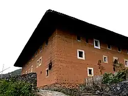 Based on the literal meaning of the Chinese words tu (土; "earth") and lou (樓; "[tall] building"), one may think of the term "tulou" as a generic description of a rammed-earth building. However, this would not be a useful definition, since, as the scholar of China's traditional architecture Huang Hanmin notes, rammed-earth building of one kind or another can be found in virtually all parts of China. Instead, it is preferable to use the definition actually used in Fujian: a tulou is a large building, constructed with load-bearing rammed earth walls, and used as a residence by a community (a group of families).[6] The first part of the definition contrasts tulous with structures that merely use rammed earth around the load-bearing wooden frame; the second part distinguishes tulous from small, single-family residencies.[6]