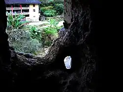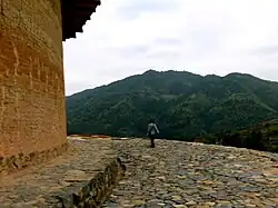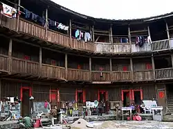 The fortified outer structures are formed by compacting earth, mixed with stone, bamboo, wood and other readily available materials to form walls up to 6 feet (1.8 m) thick. Branches, strips of wood and bamboo chips are often laid in the wall as additional reinforcement. The result is a well-lit, well-ventilated, windproof and earthquake-proof building that is warm in winter and cool in summer.[3] Tulous usually have only one main gate, guarded by 4–5-inch-thick (100–130 mm) wooden doors reinforced with an outer shell of iron plate. The top level of these earth buildings has gun holes for defensive purposes.