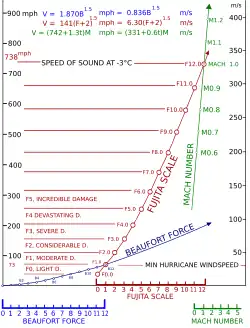A diagram illustrating the relationship between the Beaufort, Fujita, and Mach number scales
