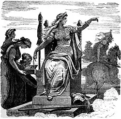 The first chapter of the Prose Edda book Skáldskaparmál, Fulla is listed among eight ásynjur who attend an evening drinking banquet held for Ægir.[7] In chapter 19 of Skáldskaparmál, poetic ways to refer to Frigg are given, one of which is by referring to her as "queen [...] of Fulla."[8] In chapter 32, poetic expressions for gold are given, one of which includes "Fulla's snood."[9] In chapter 36, a work by the skald Eyvindr skáldaspillir is cited that references Fulla's golden headgear ("the falling sun [gold] of the plain [forehead] of Fulla's eyelashes shone on [...]").[10] Fulla receives a final mention in the Prose Edda in chapter 75, where Fulla appears within a list of 27 ásynjur names.[11]