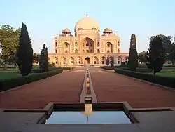 Another influence may have been the octagonal Dome of the Rock in Jerusalem, not a mausoleum itself, but "the earliest Islamic model for centrally planned commemorative buildings", adapting the Byzantine form of the martyrium in a building standing alone, though on a stone platform rather than in a garden.[132] In the Persian sphere, a tradition of relatively small mausoleums evolved, often in the shape of short hexagonal or octagonal domed towers, usually containing a single chamber, like the Malek Tomb. These single-chambered tombs developed into larger buildings in the Timurid and Mughal Empires,[133] like the Gur-e Amir tomb of Timur at Samarkand and the famous Mughal tombs of India, which culminated in the Taj Mahal. The Mughal tombs are mostly set in a large walled charbagh (chahar-bagh) or Mughal gardens, often with pavilions at the corners[133] and a gatehouse. The Taj Mahal is atypically placed at the end of the garden, backing onto the river Yamuna; a central placing is usual.[134] They may have minarets, although they do not normally function as mosques. The Tomb of Jahangir lacks any dome,[135] while the Tomb of Akbar the Great has only small decorative ones. Other Islamic Indian rulers built similar tombs, such as Gol Gumbaz.