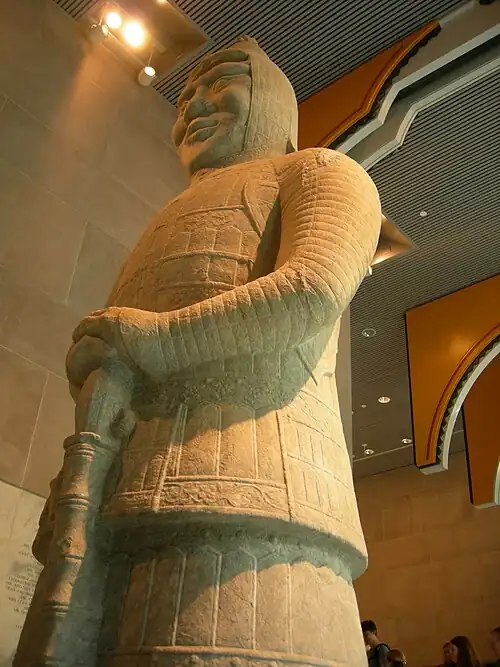 The Lei Cheng Uk Han Tomb Museum in Hong Kong displays a far humbler middle-class Han dynasty tomb, and the mid-2nd-century Wu Family tombs of Jiaxiang County, Shandong are the most important group of commoner tombs for funerary stones.[58] The walls of both the offering and burial chambers of tombs of commoners from the Han period may be decorated with stone slabs carved or engraved in very low relief with crowded and varied scenes, which are now the main indication of the style of the lost palace frescoes of the period. A cheaper option was to use large clay tiles which were carved or impressed before firing.[59] After the introduction of Buddhism, carved "funerary couches" featured similar scenes, now mostly religious.[60] During the Han dynasty, miniature ceramic models of buildings were often made to accompany the deceased in the graves; to them is owed much of what is known of ancient Chinese architecture. Later, during the Six Dynasties, sculptural miniatures depicting buildings, monuments, people and animals adorned the tops of the hunping funerary vessels.[61] The outsides of tombs often featured monumental brick or stone-carved pillar-gates (que 闕); an example from 121 CE appears to be the earliest surviving Chinese architectural structure standing above ground.[62] Tombs of the Tang dynasty (618–907) are often rich in glazed pottery figurines of horses, servants and other subjects, whose forceful and free style is greatly admired today. The tomb art reached its peak in the Song and Jin periods; most spectacular tombs were built by rich commoners.[63]