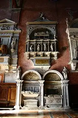 The Tomb of Antipope John XXIII in Florence is a grand Early Renaissance wall tomb by Donatello and Michelozzo; although classical in style, it reflects the somewhat inharmonious stacking up of different elements typical of major Gothic tombs. It has a life-size effigy, also known as a gisant, lying on the sarcophagus, which was common from the Romanesque period through to the Baroque and beyond.[106] Ruling dynasties were often buried together, usually in monasteries; the Chartreuse de Champmol was founded for that purpose by the Valois Dukes of Burgundy in 1383. The Scaliger tombs in Verona are magnificent free-standing Gothic canopied tombs—they are outside the church in a special enclosure, and so are unrestricted in height.[107] Important churches like St Peter's in Rome, St Paul's Cathedral, London, Santi Giovanni e Paolo, Venice (twenty-five Doges), and the Basilica of Santa Croce, Florence contain large numbers of impressive monuments to the great and the good, created by the finest architects and sculptors available. Local parish churches are also often full of monuments, which may include large and artistically significant ones for local landowners and notables. Often a prominent family would add a special chapel for their use, including their tombs; in Catholic countries, bequests would pay for masses to be said in perpetuity for their souls. By the High Renaissance, led by Michelangelo's tombs, the effigies are often sitting up, and later may stand. Often they turn towards the altar, or are kneeling facing it in profile.[108]