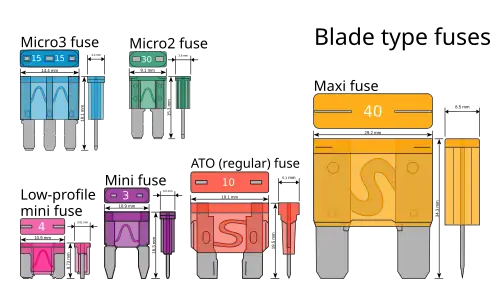 Blade type fuses come in six physical sizes: micro2, micro3, low-profile mini, mini, regular and maxi