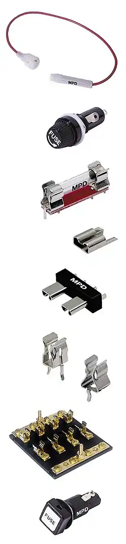 Automotive fuses are used to protect the wiring and electrical equipment for vehicles. There are several different types of automotive fuses and their usage is dependent upon the specific application, voltage, and current demands of the electrical circuit. Automotive fuses can be mounted in fuse blocks, inline fuse holders, or fuse clips. Some automotive fuses are occasionally used in non-automotive electrical applications. Standards for automotive fuses are published by SAE International (formerly known as the Society of Automotive Engineers).