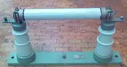 A 115 kV high-voltage fuse in a substation near a hydroelectric power plant