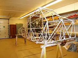 Geodesic structural elements were used by Barnes Wallis for British Vickers between the wars and into World War II to form the whole of the fuselage, including its aerodynamic shape. In this type of construction multiple flat strip stringers are wound about the formers in opposite spiral directions, forming a basket-like appearance. This proved to be light, strong, and rigid and had the advantage of being made almost entirely of wood. A similar construction using aluminum alloy was used in the Vickers Warwick with less material than would be required for other structural types. The geodesic structure is also redundant and so can survive localized damage without catastrophic failure. A fabric covering over the structure completed the aerodynamic shell (see the Vickers Wellington for an example of a large warplane which uses this process). The logical evolution of this is the creation of fuselages using molded plywood, in which several sheets are laid with the grain in differing directions to give the monocoque type below.