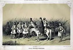The Albanian traditional costume with fustanella had identified the special troops that Albanians constituted within the Ottoman Empire, whose military prowess became renowned, especially in the era of the Ottoman Albanian pashas Ali of Yanina and Muhammad Ali of Egypt.[1] In the Napoleonic era (1799–1815) the Albanian mercenary troops (Muslim Arnaut), whose traditional costume included the fustanella, were counted among the paid Turkish government troops, along with the Janissary troops. After the disbandment of Janissary corps in 1826, the Albanian troops were employed in various armies as frontier battalions when the new Mansure Army was established within the Ottoman army by Mahmud II. In the 1820s the authorities of the Ottoman Provincial Governments overall preferred Arnaut mercenary troops over any of the standing army troops.[37]