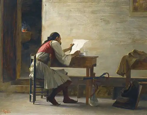 In terms of geographical spread, the fustanella never became part of the clothing worn in the Aegean islands, whereas in Crete it was associated with the heroes of the Greek War of Independence (1821) in local theatrical productions and seldom as a government uniform.[101] The men of the Greek presidential guard, founded in 1868, wear the fustanella as part of their official dress.[102] By the late 19th century, the popularity of the fustanella in Greece began to fade when Western-style clothing was introduced.[96][101] The nineteenth-century Greek painter Théodore Jacques Ralli created paintings featuring subjects wearing traditional Greek fustanella between 1873 and 1909, memorialising the traditional Greek attire. Ralli's 1903 painting A Good Read is a good example of how the painter featured the fustanella in his works.[103]
