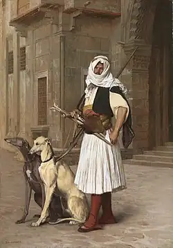 The sizeable Albanian guards and janissary troops who settled on the banks of the Nile during the early rule of Mehmed Ali' dynasty were noted for their swagger, their weapons and their costumes, particularly for the pleats of their typical white fustanellas. Those costumes played a major role in Jean-Léon Gérôme's paintings.[64]