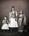 The Albanian traditional costume with fustanella had identified the special troops that Albanians constituted within the Ottoman Empire, whose military prowess became renowned, especially in the era of the Ottoman Albanian pashas Ali of Yanina and Muhammad Ali of Egypt.[1] During the late 18th and early 19th centuries Albanian warriors wore it in the Kingdom of Naples and the Ionian Islands.[2] In the 1810s, the Albanian warrior dress was officially adopted by a British regiment in the Ionian Islands.[3] In the 1820s, it became a principal visual symbol of Philhellenism, and during the Greek War of Independence it was worn by the revolutionary fighters.[4] At that time its notoriety as a symbol of male bravery and heroism grew considerably across the Ottoman Empire and spread throughout Europe.[5] Following the Greek independence, fustanella and accompanying embroidered waistcoats and jackets were adopted by the nascent Greek army. In 1835, it was proclaimed the official court costume and eventually it became the Greek national dress.[6] The Albanian-Greek attire thereafter acquired popularity among peoples who wanted to dress in a courageous heroic manner.[5]