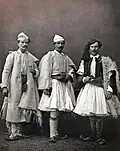 In Albanian territories the fustanella was used centuries before Ottoman rule.[28] A fustanella is depicted on a 13th-century proto-maiolica pottery fragment from Durrës.[29] A 14th-century document (1335) listing a series of items including a fustanum (a cloth made of cotton), which were confiscated from a sailor at the port of the Drin River in the Skadar Lake region of Albania.[30] In the late Byzantine period and the early Ottoman period southern Albanians migrated in Greece and in southern Italy, bringing with them their own custom, language and clothing, which included the fustanella garment.[31][32][33][34][35] In the 19th century the usage of the fustanella stretched through all Albanian inhabited lands, and it had become the ethnic costume characteristic of the Albanian men.[36]