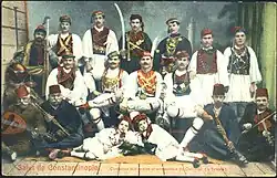 The Albanian traditional warrior costume with fustanella spread among Bulgarians, about two decades after it was dressed by the revolutionaries of the Greek War of Independence in the 1820s, when its notoriety as a symbol of male courage and heroism expanded across the region. The Albanian-Greek attire became popular particularly among young men who wanted to take a picture in a heroic pose, although not being themselves involved in fights for independence.[51]