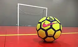 A futsal ball is smaller and heavier than a regular football, with a lower bounce.[3] Consequently, it stays mostly on the ground, which means that "heading" is less common than in association football, and aerial duels are rare.[20] Futsal shares similarities with other small-sided football variants, such as five-a-side football (same number of players) and indoor soccer (similar playing surface). However, unlike those two games, there are no walls or boards around a futsal pitch; instead, boundaries are marked with lines on the floor, as in association football.