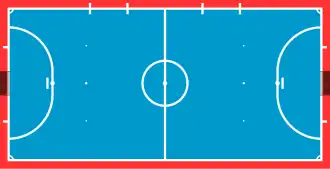 The futsal pitch is made up of wood or artificial material, or similar surface, although any flat, smooth and non-abrasive material may be used. The length of the field is in the range of 38–42 m (125–138 ft), and the width is in the range of 20–25 m (66–82 ft) for international matches. For other matches, it can be 25–42 m (82–138 ft) in length, while the width can be 16–25 m (52–82 ft), as long as the length of the longer boundary lines (touchlines) are greater than the shorter boundaries where the goals are placed (goal lines). Any standard handball field can be used for futsal, including the goals, but futsal-specific floor markings need to be added. Basketball courts of 28 m × 15 m (92 ft × 49 ft) can also be used for informal futsal.[29] The standard size court for an international match is 40 m × 20 m (131 ft × 66 ft) (the size of a handball field).[30] The minimum height of the ceiling is defined by the competition rules.