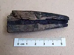 Wooden grenade fuse from the 17th Century, broken open vertically, with preserved delay charge.