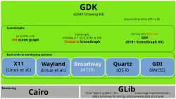 The GTK library contains a set of graphical control elements (widgets); version 3.22.16 contains 186 active and 36 deprecated widgets.[10] GTK is an object-oriented widget toolkit written in the programming language C; it uses GObject (that is, the GLib object system) for object orientation. While GTK is mainly used with windowing systems based on Wayland (and prior to that on Wayland's predecessor X11), it works on other platforms, including Microsoft Windows (interfaced with the Windows API), and macOS (interfaced with Quartz). There is also an HTML5 back-end named Broadway, although this was deprecated in 2025 with the X11 backend to indicate both would be removed in GTK version 5.[11][12][13] GTK uses Vulkan or GL to draw most graphical elements.[14]