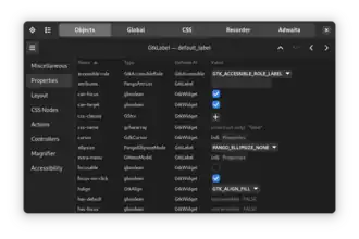 The GTK Inspector is a built-in interactive debugging tool in GTK, allowing developers to inspect and modify UI elements, test CSS changes, and analyze widget structure in real time. It can be enabled using the Control + Shift + I or Control + Shift + D shortcuts, or by setting the GTK_DEBUG=interactive environment variable.[20] It was introduced with GTK version 3.14.[21][22]
