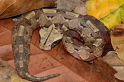 The Gaboon viper (Bitis gabonica), also called the Gaboon adder, is a large and highly venomous viper species found in the rainforests and savannas of sub-Saharan Africa.[1][3][2] It is the largest member of the genus Bitis. Like all other vipers, it is venomous,[4][5] and it has the longest fangs of any venomous snake – up to 2 inches (5.1 cm) in length – and the highest venom yield of any snake.[5][6] No subspecies are recognized.[3][7]
