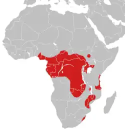 This species can be found in Guinea, Ghana, Togo, Nigeria, Cameroon, Equatorial Guinea, Gabon, the Republic of the Congo, the Democratic Republic of the Congo, northern Angola, the Central African Republic, South Sudan, Uganda, Kenya, eastern Tanzania, Zambia, Malawi, eastern Zimbabwe, Mozambique, and northeast KwaZulu-Natal Province in South Africa. Mallow et al. (2003) also list Sierra Leone, Senegal, and Liberia in West Africa.[5] The type locality is given as "Gabon" (Africa).[2]