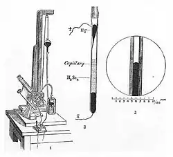 - Lippmann's electrometer consists of a tube of ordinary glass, 1 metre long and 7 millimetres in diameter, open at both ends, and kept in the vertical position by a stout support. The lower end is drawn into a capillary point, until the diameter of the capillary is .005 of a millimetre. The tube is filled with mercury, and the capillary point is immersed in dilute sulphuric acid (1 to 6 of water in volume), and in the bottom of the vessel containing the acid there is a little more mercury. A platinum wire is put into connection with the mercury in each tube, and, finally, arrangements are made by which the capillary point can be seen with a microscope magnifying 250 diameters. Such an instrument is very sensitive; and Lippmann states that it is possible to determine a difference of potential so small as that of one 10,080th of a Daniell. It is thus a very delicate means of observing and (as it can be graduated by a compensation-method) of measuring minute electromotive forces.[12][13]