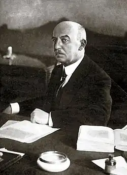 Born into a noble family with a strong patriotic sentiment, Narutowicz studied at the Saint Petersburg Imperial University before relocating to Zurich Polytechnic and completing his studies in Switzerland.[1] An engineer by profession, he was a pioneer of electrification and his works were presented at exhibitions across Western Europe. Narutowicz also directed the construction of the first European hydroelectric power plants in Monthey, Mühleberg and Andelsbuch. In 1907, he was nominated a professor of hydroelectric and water engineering in Zurich, and was subsequently assigned to maintain the Rhine. In September 1919, Narutowicz was invited by the Polish authorities to work on reconstruction projects in the aftermath of World War I. In June 1920, Narutowicz became the minister of public works in Władysław Grabski’s government. Following his successful conduct of the Polish delegation at the Genoa Conference, he became the minister of foreign affairs in Artur Śliwiński's cabinet.