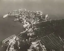 View of Monte Orlando from a former anti-aircraft position on Serapo's seaside. The Montagna Spaccata is the sharply vertical cliff on the right side of the promontory. The bastions of Charles V can be seen just in the lower left corner of the convent in the woods.