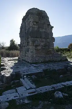 Many honors were heaped upon Gaius by citizens and city officials of the Empire, including Colonia Obsequens Iulia Pisana (Pisa), where it was decreed that proper rites must be observed by matrons to lament his passing. Temples, public baths, and shops shut their doors as women wept inconsolably. To commemorate his brief life, a cenotaph was erected on the Limyrus River at Limyra in Lycia.[62] Posthumously, the Senate voted honours for the young Caesars, and arranged for the golden spears and shields the boys had received on achieving the age of military service to be hung in the Senate House.[62] The caskets containing their ashes were stored in the Mausoleum of Augustus alongside those of their father Agrippa and other members of the imperial family.[62]
