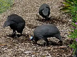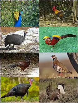 | Clockwise from top left: Indian peafowl (Pavo cristatus), red junglefowl (Gallus gallus), golden pheasant (Chrysolophus pictus), red-legged partridge (Alectoris rufa), Gunnison grouse (Centrocercus minimus), wild turkey (Meleagris gallopavo), great curassow (Crax rubra), helmeted guineafowl (Numida meleagris) | |