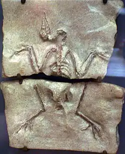 Fossils of these galliform-like birds originate in the Late Cretaceous, most notably those of Austinornis lentus. Its partial left tarsometatarsus was found in the Austin Chalk near McKinney, Texas, dating to about 85 million years ago (Mya). This bird was quite certainly closely related to Galliformes, but whether it was a part of these or belongs elsewhere in the little-known galliform branch of Galloanserae is not clear. However, in 2004, Clarke classified it as a member of the larger group Pangalliformes, more closely related to chickens than to ducks, but not a member of the crown group that includes all modern galliformes.[10] Another specimen, PVPH 237, from the Late Cretaceous Portezuelo Formation (Turonian-Coniacian, about 90 Mya) in the Sierra de Portezuelo (Argentina) has also been suggested to be an early galliform relative. This is a partial coracoid of a neornithine bird, which in its general shape and particularly the wide and deep attachment for the muscle joining the coracoid and the humerus bone resembles the more basal lineages of galliforms.[11]