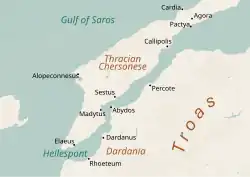 In ancient times, the Gallipoli Peninsula was known as the Thracian Chersonese (from Greek χερσόνησος, 'peninsula'[2]) to the Greeks and later the Romans. It was the location of several prominent towns, including Cardia, Pactya, Callipolis (Gallipoli), Alopeconnesus (Ἀλωπεκόννησος), Sestos, Madytos, and Elaeus. The peninsula was renowned for its wheat. It also benefited from its strategic importance on the main route between Europe and Asia, as well as from its control of the shipping route from Crimea. The city of Sestos was the main crossing-point on the Hellespont.