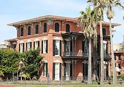 The Galvez Hotel is a historic hotel that opened in 1911.[75] The building was named the Galvez, honoring Bernardo de Gálvez y Madrid, Count of Gálvez, for whom the city was named. The hotel was added to the National Register of Historic Places on April 4, 1979. The Michel B. Menard House, built in 1838 and the oldest surviving structure in Galveston, is designed in the Greek revival style. In 1880, the house was bought by Edwin N. Ketchum who was police chief of the city during the 1900 Storm. The Ketchum family owned the home until the 1970s. Ashton Villa, a red-brick Victorian Italianate home, was constructed in 1859 by James Moreau Brown. One of the first brick structures in Texas, it is listed on the National Register of Historic Places and is a recorded Texas Historic Landmark. The structure is also the site of what was to become the holiday known as Juneteenth, where on June 19, 1865, Union General Gordon Granger, standing on its balcony, read the contents of "General Order No. 3", thereby emancipating all slaves in the state of Texas.[76][77][78]