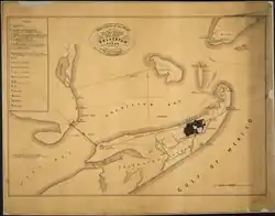 Indigenous inhabitants of Galveston Island called the island Auia.[8] Though there is no certainty regarding their route and their landings, Cabeza de Vaca and his crew were shipwrecked at a place he called "Isla de Malhado" in November 1528. This could have referred to Galveston Island or San Luis Island.[9] During his charting of the Gulf Coast in 1785, the Spanish explorer José de Evia labeled the water features surrounding the island "Bd. de Galvestown" and "Bahia de Galvestowm" [sic]. He was working under the orders of Bernardo de Gálvez. In his early chart, he called the western end of the island "Isla de San Luis" and the eastern end "Pt. de Culebras". Evia did not label the island itself on his map of 1799. Just five years later, Alexander von Humboldt borrowed the place names Isla de San Luis, Pte. De Culebras, and Bahia de Galveston. Stephen F. Austin followed his predecessors in the use of "San Luis Island", but introduced "Galveston" to refer to the little village at the east end of the island. Evidence of the name Galveston Island appears on an 1833 map by David H. Burr.[8]