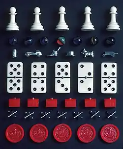 A selection of pieces from different games. From top: Chess pawns, marbles, Monopoly tokens, dominoes, Monopoly hotels, jacks and checkers pieces.