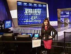 Announcer Kelly Miyahara on the set of US gameshow Jeopardy!, in 2009