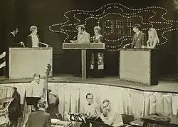 Truth or Consequences was the first game show to air on commercially licensed television;[25] CBS Television Quiz followed shortly thereafter as the first to be regularly scheduled.[26] The first episode of each aired in 1941 as an experimental broadcast. Over the course of the 1950s, as television began to pervade the popular culture, game shows quickly became a fixture. Daytime game shows would be played for lower stakes to target stay-at-home housewives. Higher-stakes programs would air in prime time. (One particular exception in this era was You Bet Your Life, ostensibly a game show, but the game show concept was largely a framework for a talk show moderated by its host, Groucho Marx.) During the late 1950s, high-stakes games such as Twenty-One and The $64,000 Question began a rapid rise in popularity.[27] However, the rise of quiz shows proved to be short-lived. In 1959, many of the higher stakes game shows were exposed as being either biased or outright scripted in the 1950s quiz show scandals and ratings declines led to most of the primetime games being canceled.