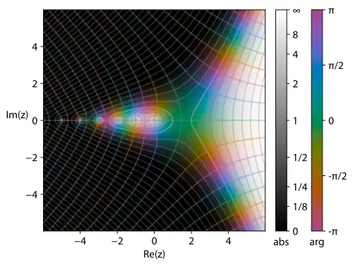 For the simple pole , the recurrence formula can be rewritten as:The numerator at , isand the denominatorSo the residues of the gamma function at those points are:[14]The gamma function is non-zero everywhere along the real line, although it comes arbitrarily close to zero as . There is in fact no complex number for which , and hence the reciprocal gamma function is an entire function, with zeros at .[1]