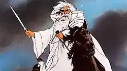 In a 1946 letter, Tolkien stated that he thought of Gandalf as an "Odinic wanderer".[T 39] Other commentators have similarly compared Gandalf to the Norse god Odin in his "Wanderer" guise—an old man with one eye, a long white beard, a wide brimmed hat, and a staff,[10][11] or likened him to Merlin of Arthurian legend or the Jungian archetype of the "wise old man".[12]