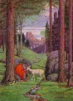 Tolkien's biographer Humphrey Carpenter relates that Tolkien owned a postcard entitled Der Berggeist ("the mountain spirit"), which he labelled "the origin of Gandalf".[3] It shows a white-bearded man in a large hat and cloak seated among boulders in a mountain forest. Carpenter said that Tolkien recalled buying the postcard during his holiday in Switzerland in 1911. Manfred Zimmerman, however, discovered that the painting was by the German artist Josef Madlener and dates from the mid-1920s. Carpenter acknowledged that Tolkien was probably mistaken about the origin of the postcard.[4]