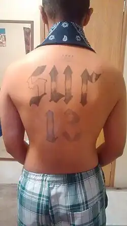Most gang members have identifying characteristics which are unique to their specific clique or gang.[125] The Bloods, for instance, wear red bandanas, the Crips blue, allowing these gangs to "represent" their affiliation. Any disrespect of a gang member's color by an unaffiliated individual is regarded as grounds for violent retaliation, often by multiple members of the offended gang. Tattoos are also common identifiers,[126] such as an '18' above the eyebrow to identify a member of the 18th Street gang. Tattoos help a gang member gain respect within their group, and mark them as members for life. Tattoos can also represent the level they are in the gang, being that certain tattoos can mean they are a more accomplished member. The accomplishments can be related to doing a dangerous act that showed your loyalty to the gang. They can be burned on as well as inked. Some gangs make use of more than one identifier, like the Nortenos, who wear red bandanas and have "14", "XIV", "x4", and "Norte" tattoos.[127] Some members of criminal gangs are "jumped in" (by going through a process of initiation), or have to prove their loyalty and right to belong by committing certain acts, usually theft or violence.