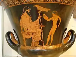Plato accounts for the pederastic aspect of the myth by attributing its origin to Crete, where the social custom of paiderastía was supposed to have originated (see "Cretan pederasty").[34] Athenaeus recorded a version of the myth where Ganymede was lusted and abducted not by Zeus but instead by the legendary King Minos to serve as his cup-bearer.[35][36] Some authors have equated this version of the myth to Cretan pederasty practices, as recorded by Strabo and Ephoros, which involved abduction of a youth by an older lover for a period of two months before the youth was able to re-enter society as a man.[36] Xenophon portrays Socrates denying that Ganymede was the catamite of Zeus, instead asserting that the god loved him for his psychē, "mind" or "soul", giving the etymology of his name as ganu- "taking pleasure" and mēd- "mind." Xenophon's Socrates points out that Zeus did not grant any of his lovers immortality, but that he did grant immortality to Ganymede.[37]
